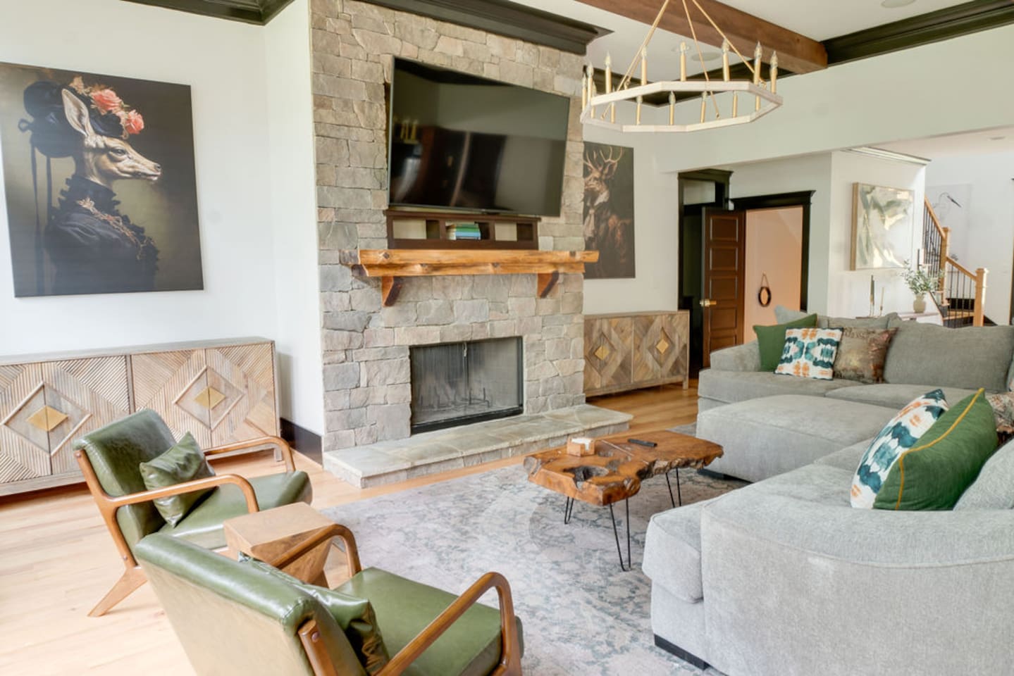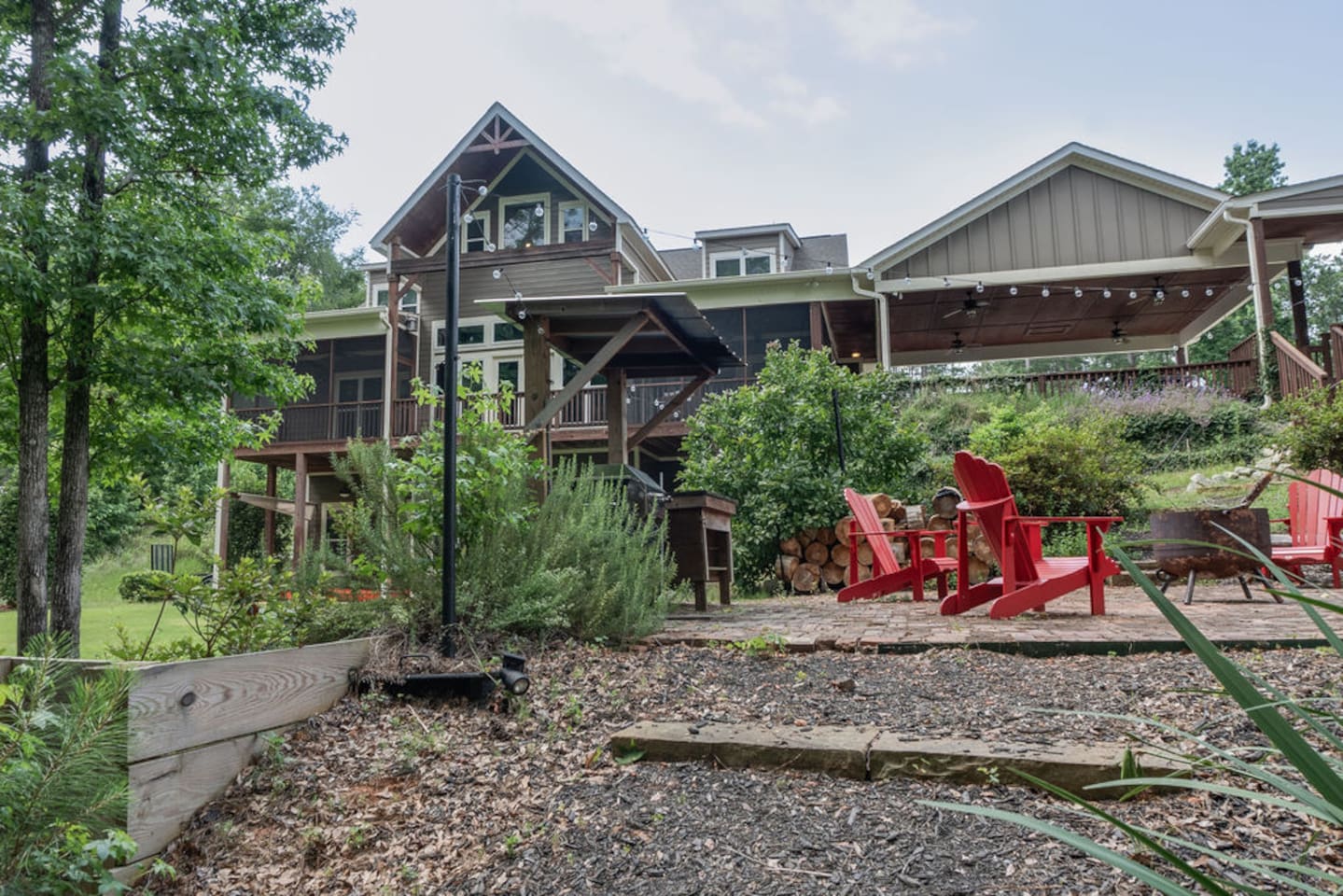 Live like a movie star at this lakefront retreat featured on the Destination Channel’s Staycation Sports! This two-home estate sleeps 28 with 9 bedrooms, each with a dedicated bath, and two full kitchens. Designed with something for all ages, enjoy a bunk room, playhouse, arcade-style game room, board games, fireplaces, outdoor lounging, fire pit, and private dock. Also includes beach access, kayaks and paddle boards, ping pong, disc golf, a basketball court, ample parking, and is pet-friendly.