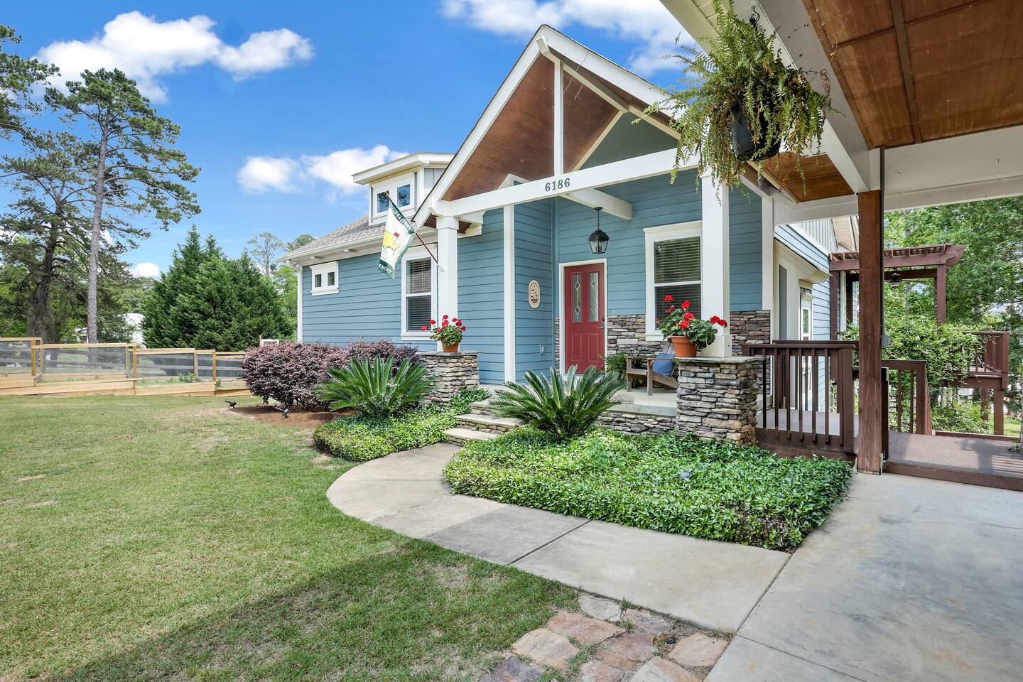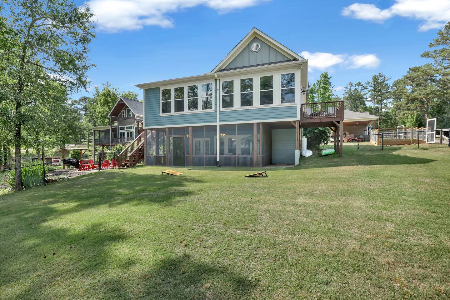 Live like a movie star at this sprawling lakefront retreat, famously featured on the Destination Channel’s “Staycation Sports” (Season 1, Episode 16)! This unique property combines two beautiful homes into one exclusive estate, offering the perfect high-end getaway for large families or group vacations of up to 28 guests. KEY FEATURES: Premier waterfront property with a 2 story private dock for unparalleled lake access, and relaxation. Two fully-equipped kitchens, as well as an additional kitchenette. Four distinct living spaces filled with bright, natural light. Game room, ping pong table, and a basketball court. Cozy outdoor fire pit for stories and stargazing. Bunk house room featuring a play house with kid toys and plenty of family board games Area with a desk for a workspace if guests have to do some work while on vacation, with high speed internet. SLEEPING ARRANGEMENTS (28 Guests Total): Main House - Sleeps 20 Main Level Primary Bedroom: King bed with a spacious ensuite bathroom (soaking tub & separate walk-in shower). Upper Level Bedroom 2 (Fish Room): Queen bed and a twin bed with an ensuite bathroom (tub/shower combo). Upper Level Bedroom 3 (Bunk Room): Three queen beds and a children’s playhouse. A dedicated bathroom is on the landing (tub/shower combo). Upper Level Bedroom 4 (Flower Room): Queen bed and a full bed with an ensuite bathroom (tub/shower combo). Basement Bedroom 5 (Alligator Room): Queen bed with a shared bathroom (tub/shower combo) that also opens to the hallway. Basement Bedroom 6 (Butterfly Room): Two queen beds with a bathroom just outside the room (walk-in shower). Second House - Sleeps 8 Main Level Primary Bedroom: Queen bed with an ensuite bathroom (tub/shower combo). Main Level Bedroom 2: Queen bed with access to a hall bathroom (walk-in shower). Basement Bedroom 3: Queen bed with access to a hall bathroom (walk-in shower). Bonus Sleeping Area: A queen Murphy bed is available in the downstairs living area.