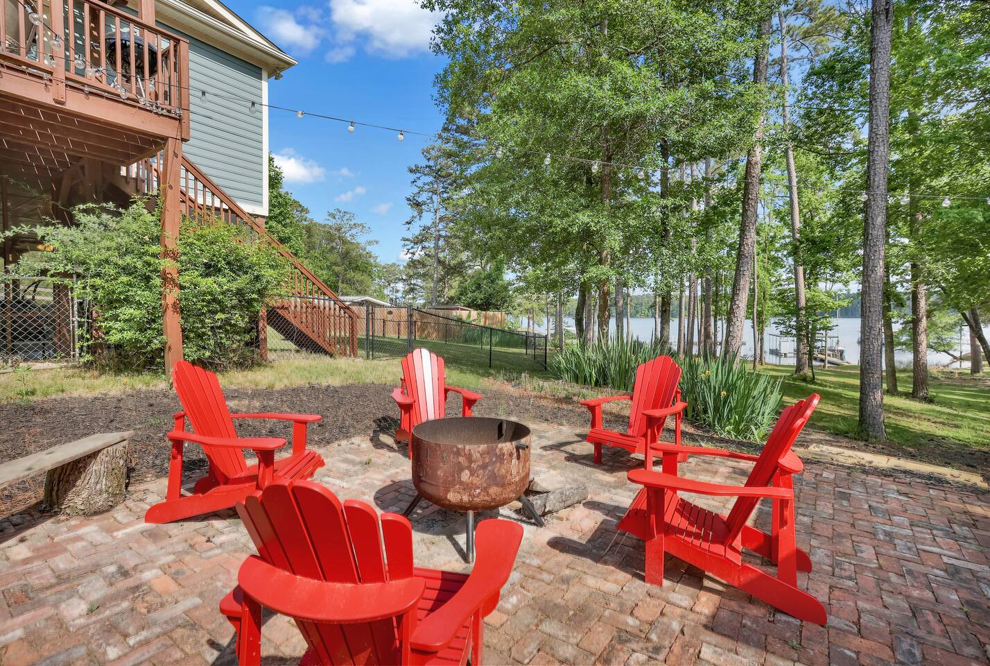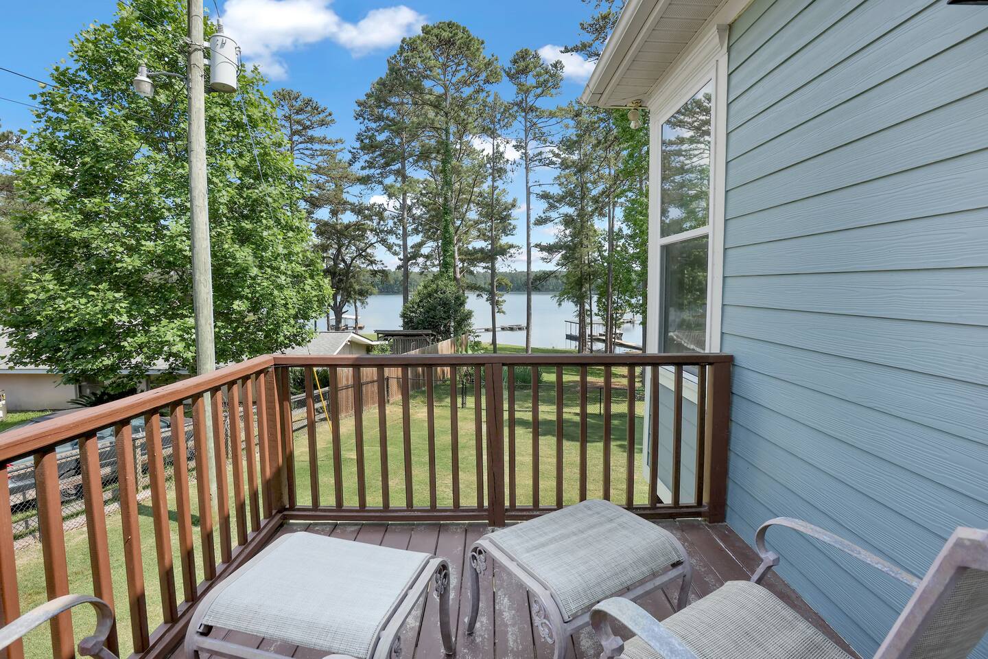 The home is the small blue home which has 3 bedrooms, all with a queen bed. All linens are provided. there are also 3 full bathrooms that come which also come with linens. There is also an additional queen murphy bed in the down stairs living area. There are 2 tv areas, 2 tables, and reading area by the fireplace, and lots of deck and patio space. There is plenty of outside space, a private fenced in yard and use of the dock. The dock is private to the property, but will be shared with another short term rental. Common areas which are shared with the other home are the fire pit and smoker, as well as the basketball court, and the dock.