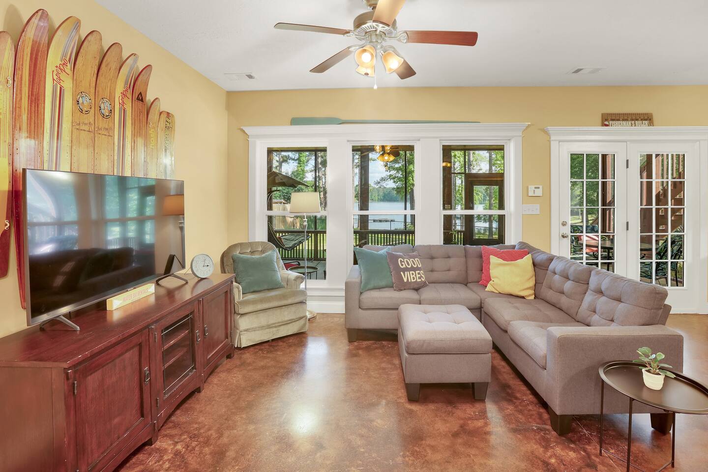 As seen on Destination Channel’s Staycation Sports! Vacation like a celebrity at Keg Creek Cottage on Clarks Hill Lake. Nestled in a quiet cove perfect for swimming or fishing, with dock access for your boat. Enjoy a fenced yard for pets, a screened porch, fire pit (shared), and Rec Teq grill. Kayaks, paddle boards, and cornhole included for fun on and off the water.